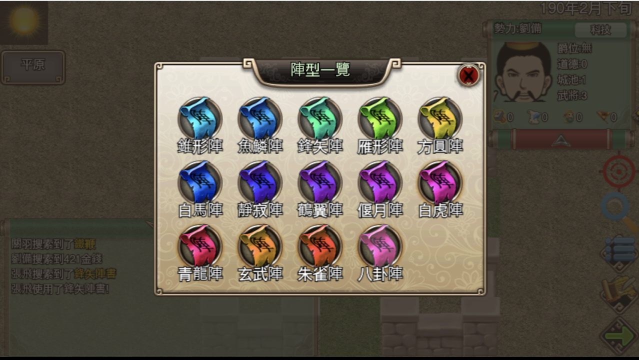 編成部隊時可選擇「陣形」。不同的陣型有不同的加減效果。比如攻城可以選擇攻城效果增加的鶴翼陣,防守可以選擇方圓陣。