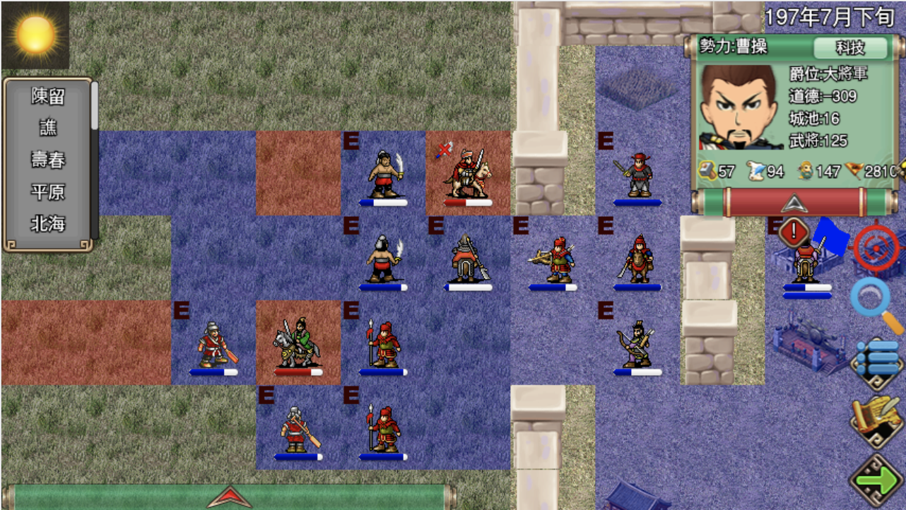 | 青州兵 | 曹操將青州黃巾軍的精銳進行收編,組成了戰鬥力極強的青州兵,青州兵每人手持長槍,跟一般的步兵相比,雖然只能攻擊四個方向,但是攻擊範圍更遠! |