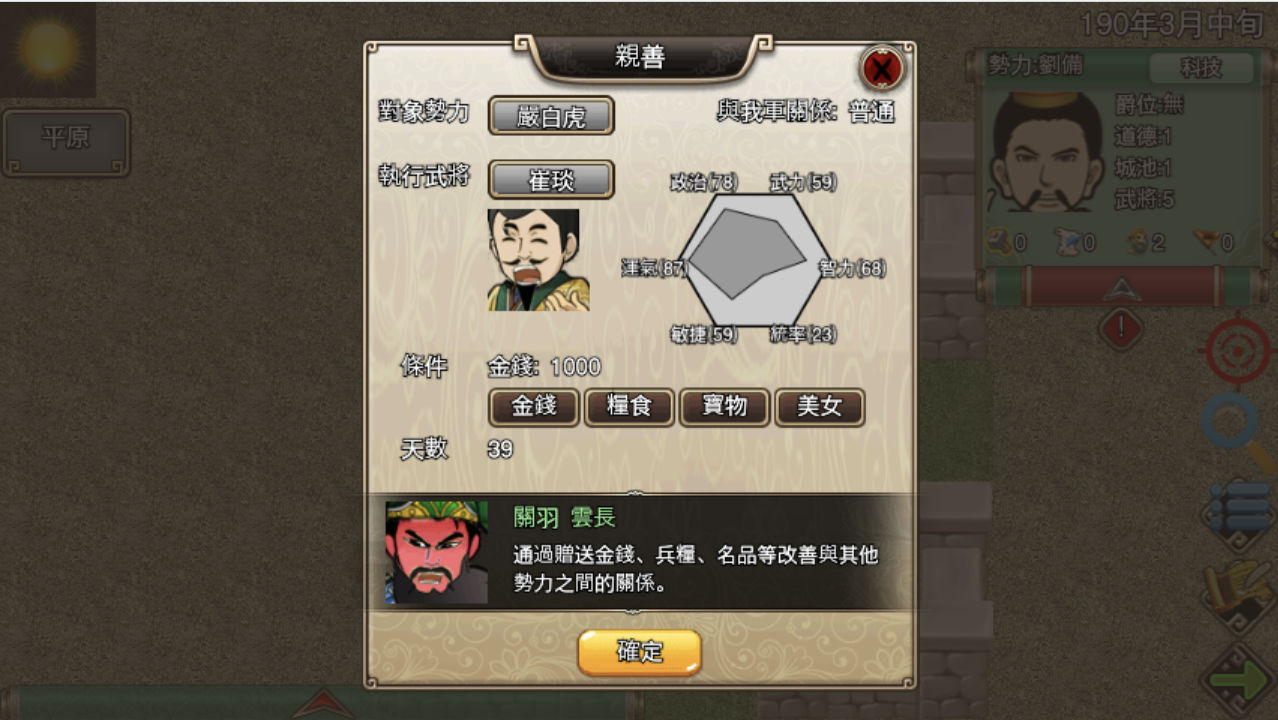 | 親善 | 透過贈送金錢、兵糧等改善與其他勢力之間的關係。 |